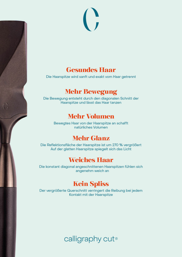 Der Calligraphy Cut ist eine besondere Haarschneidetechnik mit einem besonderen Werkzeug: Dem Calligraphen. Durch die besonders scharfe Klinge und den exakten 21-Grad-Winkel in dem deine Haare geschnitten werden erhalten sie besonders viel Sprungkraft und bleiben langfristig gesund.